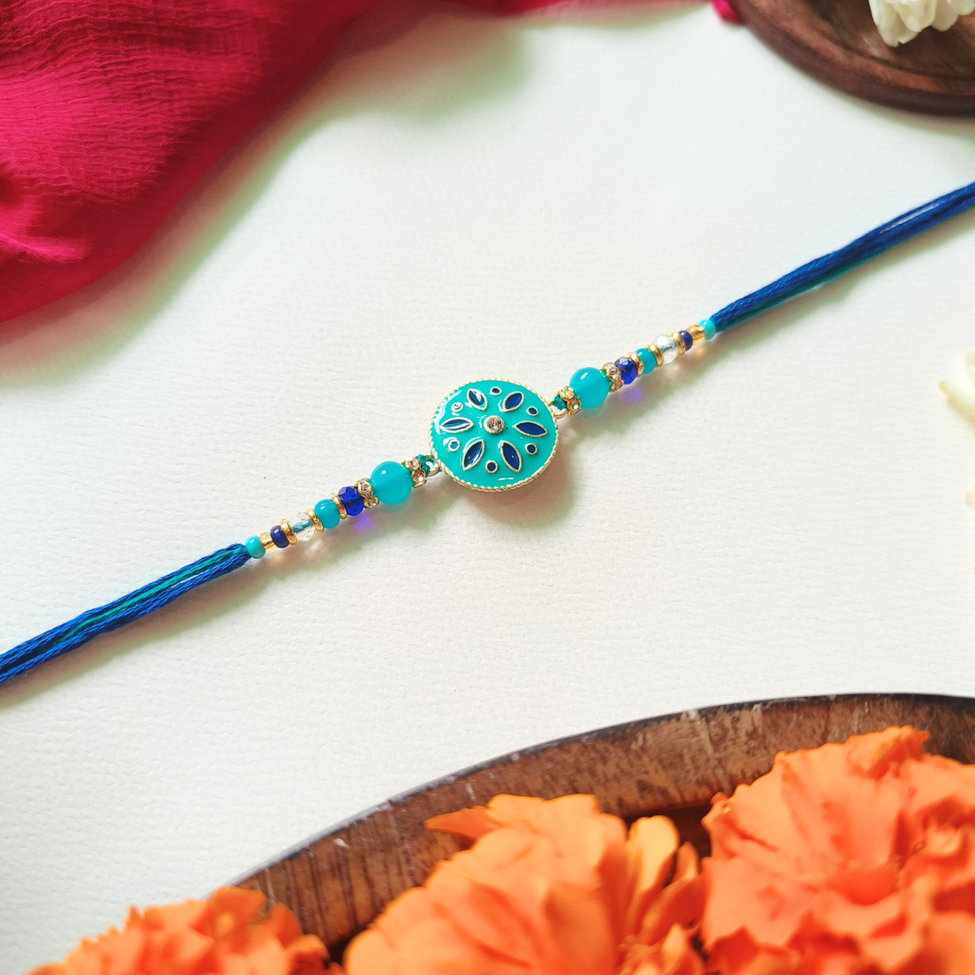 Celebrate the bond of love and protection with this handcrafted Peacock Blue Enamel Rakhi. Featuring a stunning round enamel centerpiece with intricate floral motifs, this rakhi is beautifully accented with vibrant turquoise and royal blue beads, and finished with delicate golden embellishments. The soft silk thread ensures comfort while adding a touch of traditional charm. Perfect for a brother who appreciates style and sentiment.